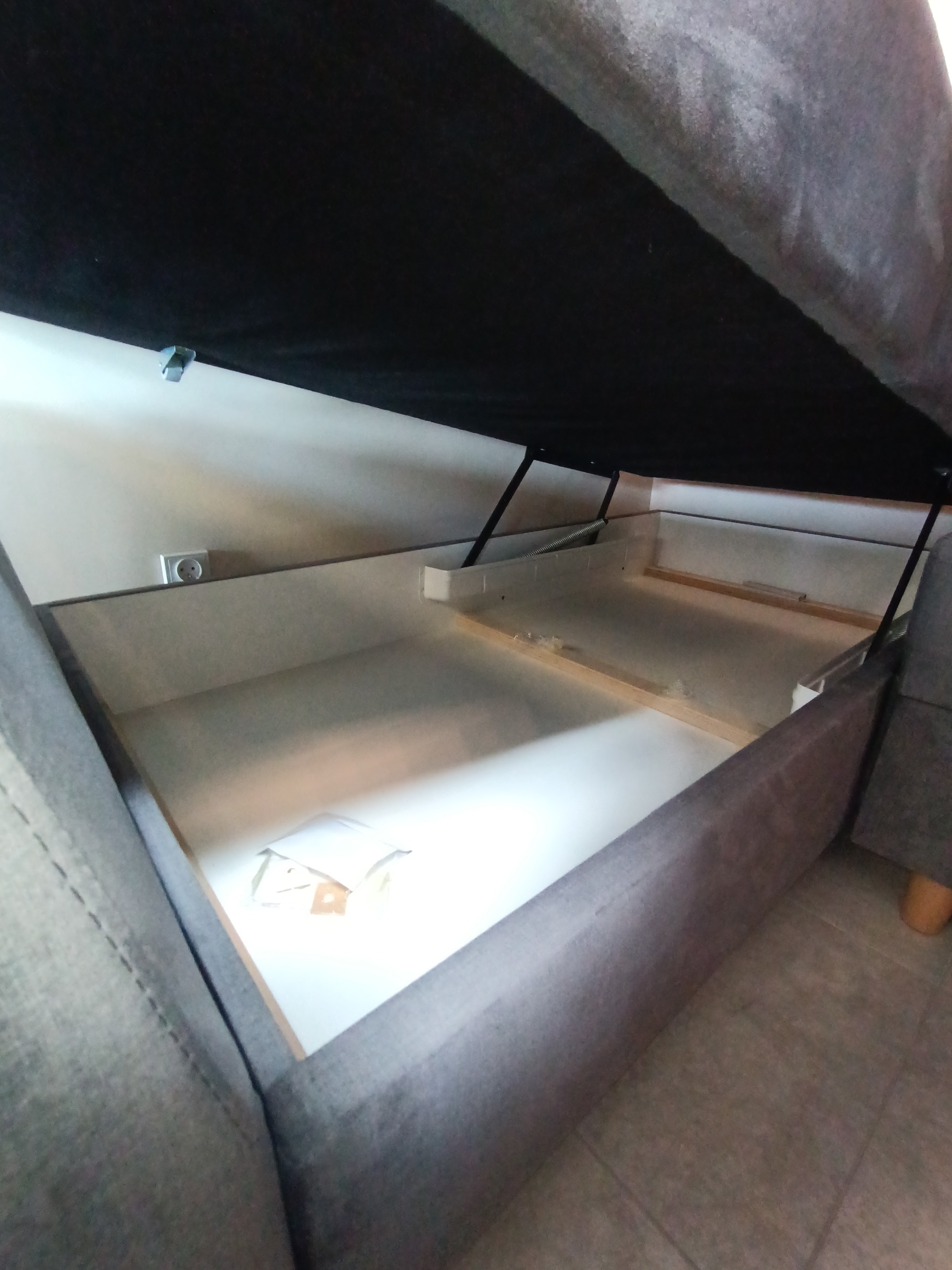 Praktyczne Przechowywanie: Mebel posiada duży pojemnik na pościel z łatwym dostępem, który pozwala na wygodne przechowywanie pościeli lub innych tekstyliów, pomagając utrzymać porządek w salonie.